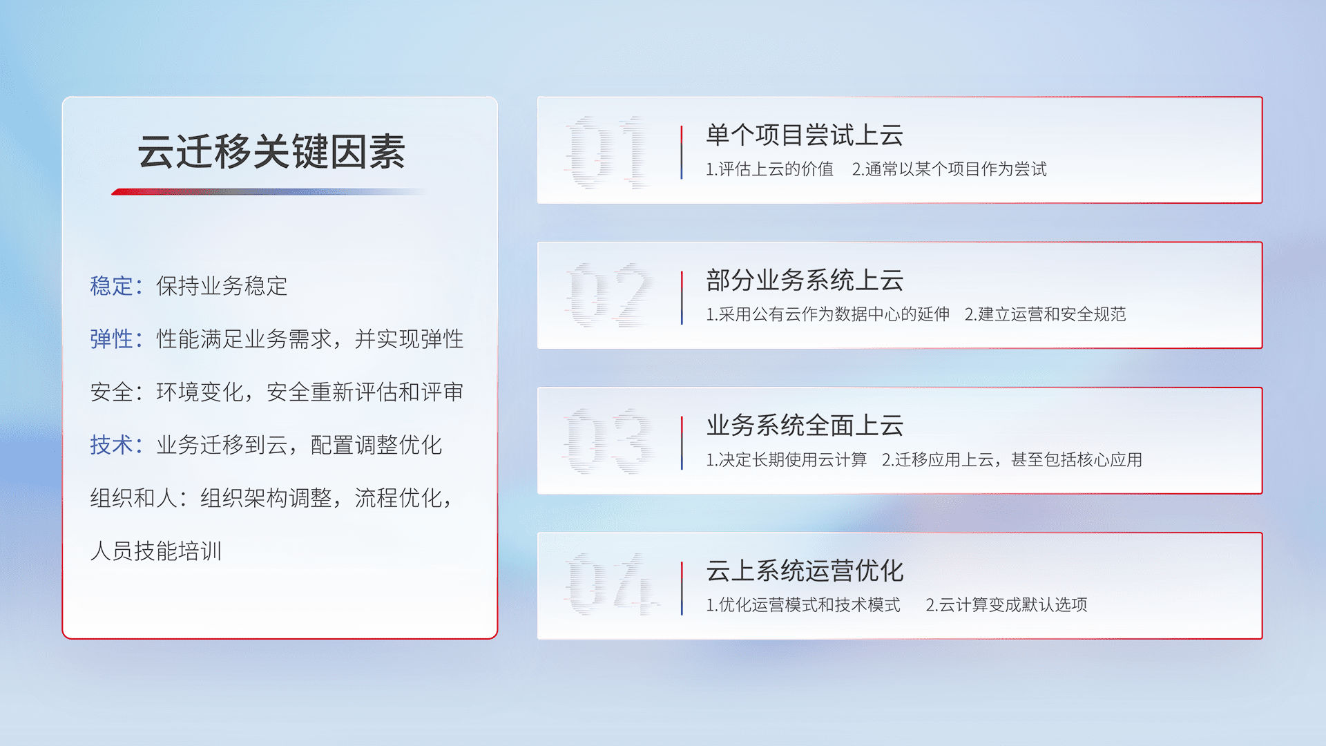 结合实际业务,,从规划设计、、云平台选型、、、云原生改造、、、、数据迁移、、、集成交付,,,迁移全过程为客户识别最佳上云路径,,做好风险识别管理,,,,设计网络架构、、身份权限、、、安全审计合规、、、、操作审计、、、、日志审计、、监控告警策略、、、、多站点容灾设计等,,,对云上基础设施进行整体规划,,提升IT治理水平,,,以满足弹性、、、、高可用、、、高性能的需求。。。。