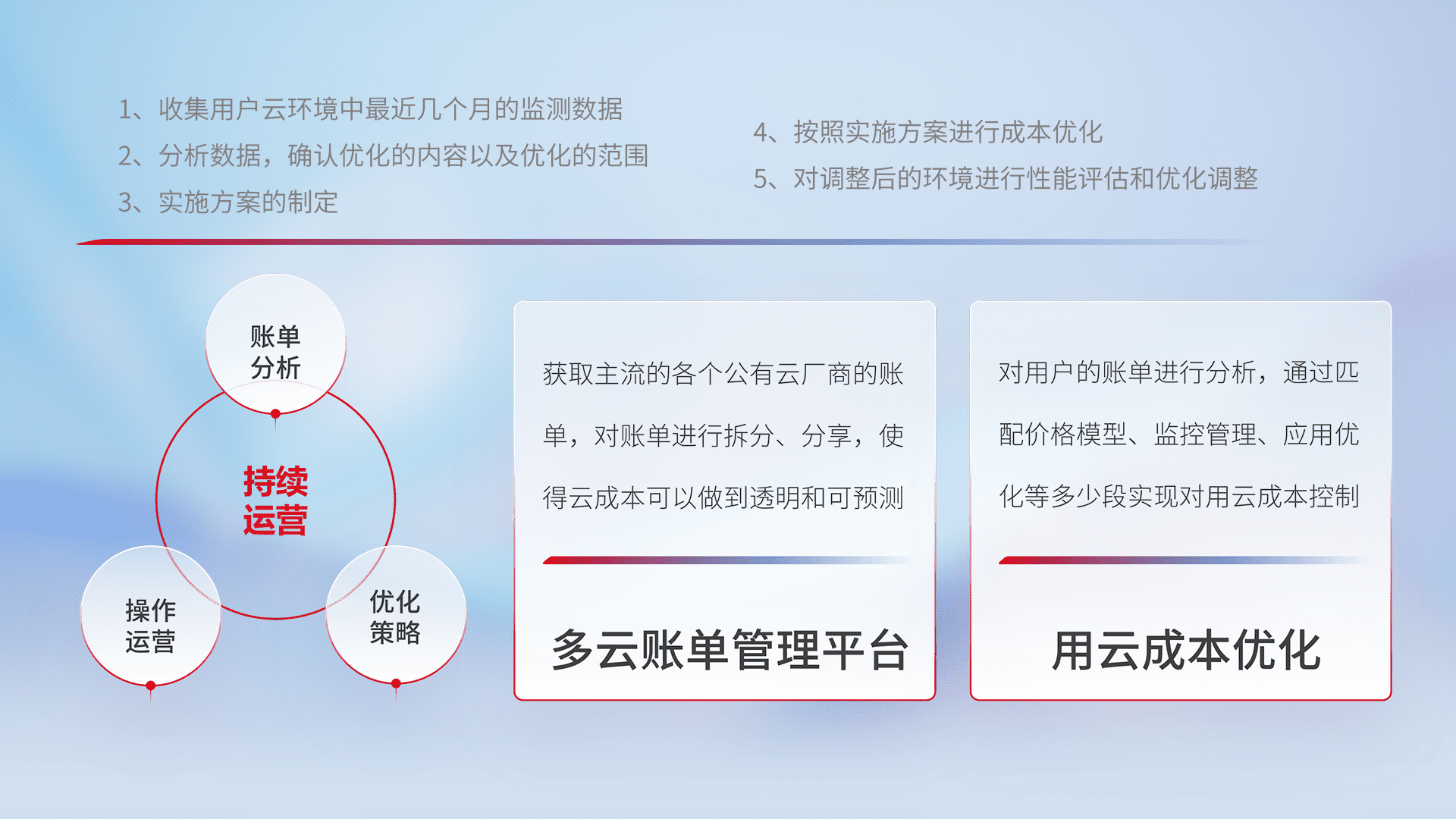 通过多云纳管,,,以统一的资源数据模型把客户的云资源进行抽象和封装,,,进而实现对多云资源的统一操作,,,保障云资源管理的可靠性、、、稳定性与可用性。。量身定制化运维内容,,,配置、、开发运维、、、补丁管理、、、备份、、、、监控、、认证和访问管理、、、审计和日常巡检等,,,,保障在用云过程中的可靠度,,,稳定度以及高可用率。。。。